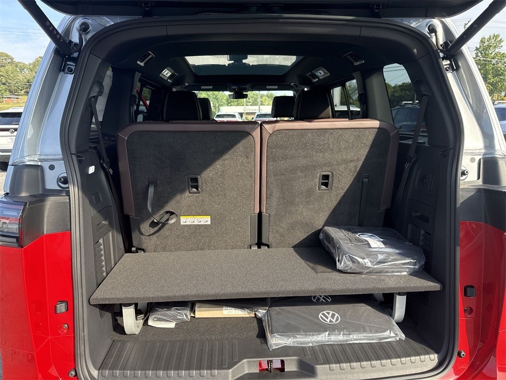 14 Speakers, 3rd row seats: split-bench, ABS brakes, Air Conditioning, Alloy wheels, Auto High-beam Headlights, Auto-dimming Rear-View mirror, Automatic temperature control, Brake assist, Bumpers: body-color, Delay-off headlights, Driver door bin, Driver vanity mirror, Driver's Seat Mounted Armrest, Dual front impact airbags, Dual front side impact airbags, Electronic Stability Control, Emergency communication system: VW Car-Net Safe & Secure 5-year, Exterior Parking Camera Rear, Four wheel independent suspension, Front anti-roll bar, Front Bucket Seats, Front dual zone A/C, Front fog lights, Front reading lights, Fully automatic headlights, harman/kardon® Speakers, Heads-Up Display, Heated & Actively Ventilated Front Seats, Heated door mirrors, Heated front seats, Heated rear seats, Heated steering wheel, Heritage Mats for Moonlight Interior w/2nd Row Captains, Illuminated entry, Leather steering wheel, Low tire pressure warning, Memory seat, Navigation System, Occupant sensing airbag, Outside temperature display, Overhead airbag, Panic alarm, Panoramic Glass Roof, Passenger door bin, Passenger seat mounted armrest, Passenger vanity mirror, Perforated V-Tex Leatherette Seating Surfaces, Power door mirrors, Power driver seat, Power Liftgate, Power passenger seat, Power steering, Power windows, Radio data system, Radio: Discover Pro Max w/Touchscreen Navigation, Rain sensing wipers, Rear air conditioning, Rear anti-roll bar, Rear reading lights, Rear window defroster, Rear window wiper, Remote keyless entry, Speed control, Speed-sensing steering, Split folding rear seat, Spoiler, Steering wheel mounted audio controls, TBD Axle Ratio, Telescoping steering wheel, Tilt steering wheel, Traction control, Trip computer, Turn signal indicator mirrors, Variably intermittent wipers, Ventilated front seats, VW Care, and Wheels: 20 Two-Tone Disc AlloY.